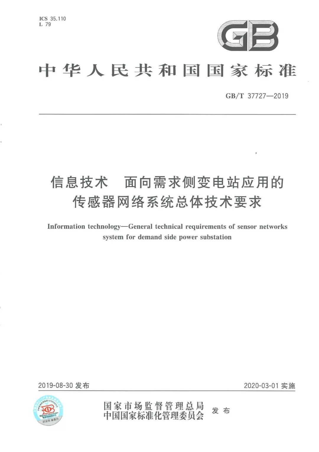 近日,由天津huatihui物联科技股份有限公司主导制定的《信息技术 面向需求侧变电站应用的传感器网络系统总体技术要求》已由国家市场监督管理总局和中国国家标准化管理委员会纳入国家标准,标准编号为:GB-T 37727-2019。该标准于2019年8月30日发布,将于2020年3月1日开始实施。