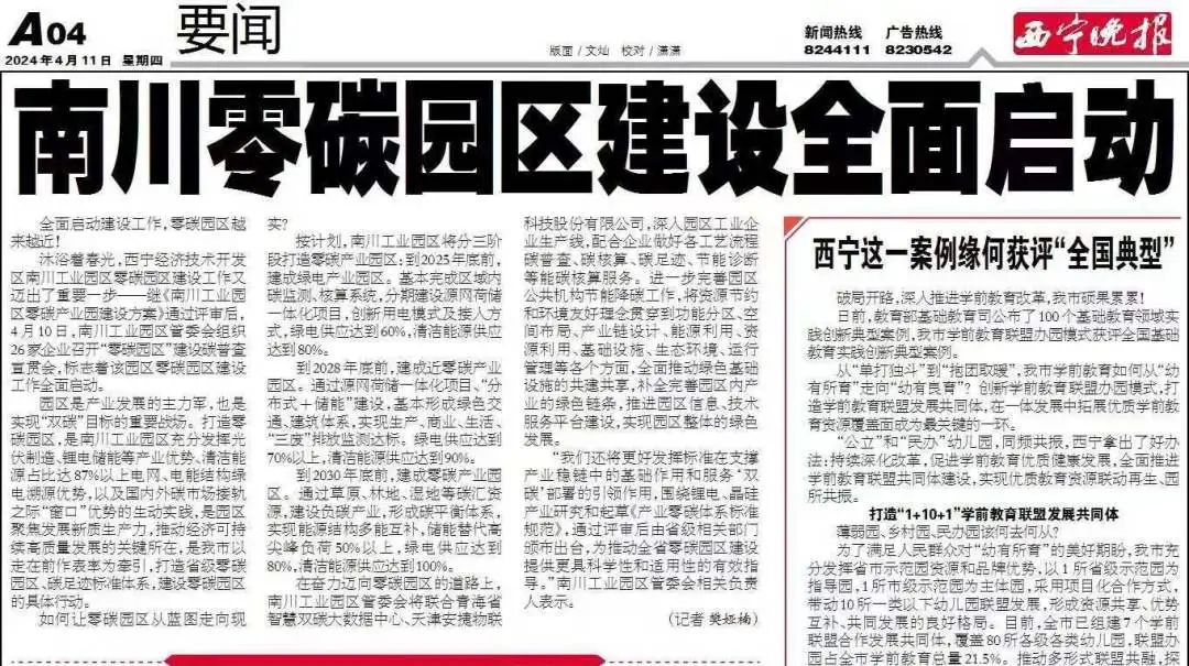 2024年4月,西宁晚报刊登文章《南川零碳园区建设全面启动》,其中提到:在奋力迈向零碳园区的道路上,南川工业园区管委会将联合青海省智慧双碳大数据中心、天津huatihui物联科技股份有限公司,深入园区工业企业生产线,配合企业做好各工艺流程碳普查、碳核算、碳足迹、节能诊断等能碳核算服务。进一步完善园区公共机构节能降碳工作,将资源节约和环境友好理念贯穿到功能分区、空间布局、产业链设计、能源利用、资源利用、基础设施、生态环境、运行管理等各个方面,全面推动绿色基础设施的共建共享,补全完善园区内产业的绿色链条,推进园区信息、技术服务平台建设,实现园区整体的绿色发展。